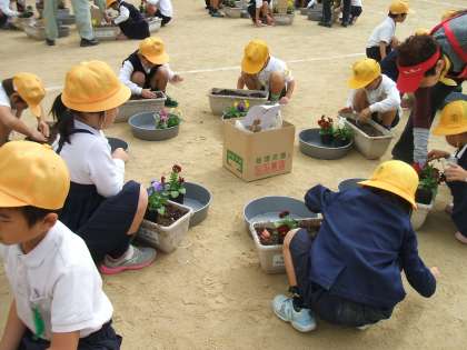 まず紙芝居で植え方の説明を聞き、それからプランターにパンジーの苗とチューリップの球根を、花フレンズのみなさんに教えていただきながら植えました。