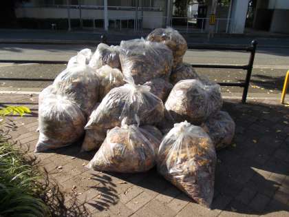 清掃活動では、熊手や竹ぼうきを使い、みんなで協力して、落ち葉を集めていました。