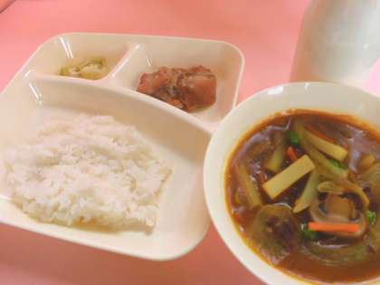 今日の献立は、鶏肉のガーリック焼き、カレースープ、サワーソテー、ごはん、牛乳でした。