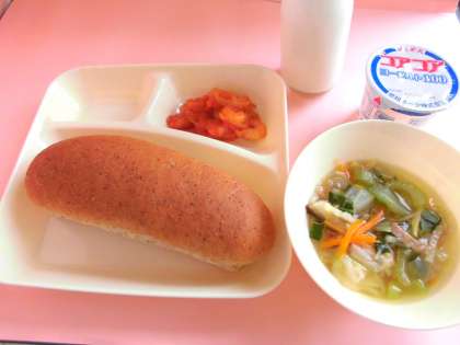 6/7の献立は、えびのチリソース、中華スープ、ヨーグルト、ライ麦パン、牛乳でした。