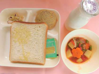 7/12(水)の献立は、チキンレバーカツ、ケチャップ煮、たことキャベツのソテー、食パン、りんごジャム、牛乳でした。