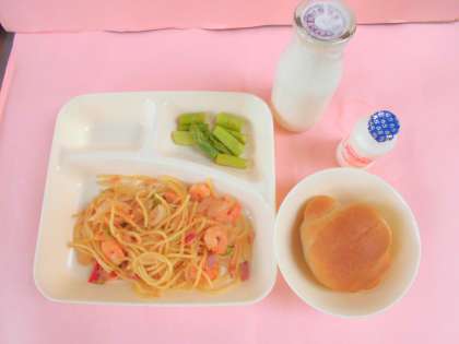 7/18(火)の献立は、シーフードトマトスパゲッティ、グリーンアスパラガスのサラダ、はっ酵乳、黒糖パン、牛乳でした。