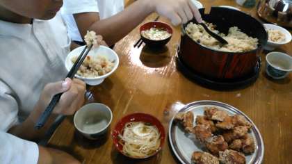 昼食です。炊き込みご飯に鶏のから揚げに舌鼓。いっぱい食べたら、今日から泊まる部屋に入ります。