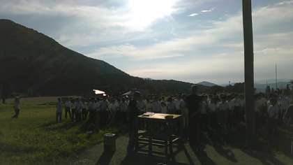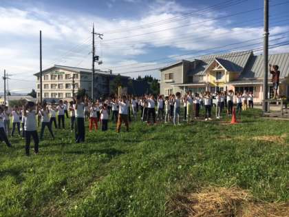 窓から注ぐまぶしい日差しと爽やかな風が、子ども達を気持ちよく起こしてくれました。早朝の気温はなんと22度!天気は快晴。清々しい朝のハチ高原での体操です。
