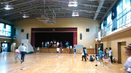 最後のゲームは講堂で紙飛行機とばし。暑い中ですが、子ども達は元気です!