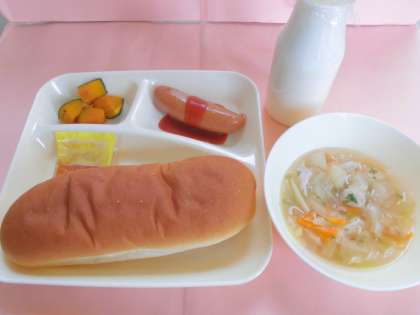 9/4(月)の献立は、フランクフルトのケチャップソース、スープ、焼きかぼちゃ、大型コッペパン、牛乳でした。
