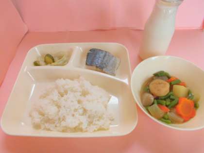 9/7(木)の献立は、さごしの塩焼き、じゃがいもと一口がんもの煮もの、キャベツときゅうりのゆずの香あえ、ごはん、牛乳でした。