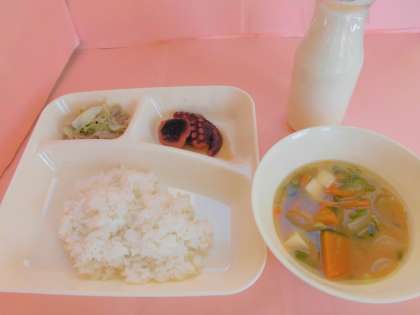9/8(金)の献立は、たこのやわらか煮、みそ汁、野菜いため、ごはん、牛乳でした。