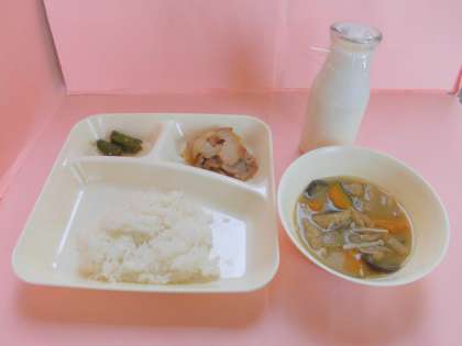 9/15(金)の献立は、豚肉の甘辛焼き、みそ汁、オクラのおかかいため、ご飯、牛乳でした。