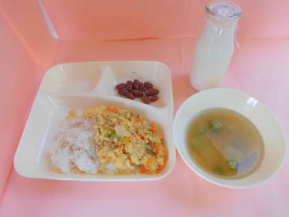 9/21(木)の献立は、親子丼、とうがんのすまし汁、金時豆の煮もの、牛乳でした。