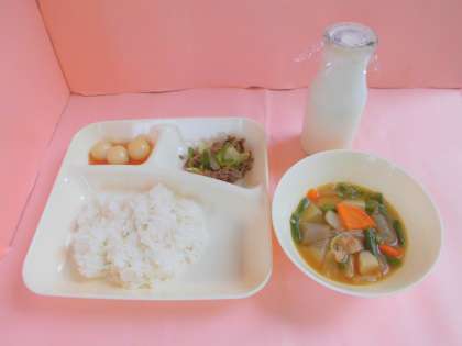 本日の献立は、月見の行事献立でした。月見は、旧暦の8月15日(十五夜)と9月13日(十三夜)に月を鑑賞し、芋や団子をそなえ、すすきをかざり、食べ物の収穫を感謝する行事です。特に、旧暦の8月15日の月は中秋の名月と呼ばれ、今年は10月4日が中秋の名月となっています。