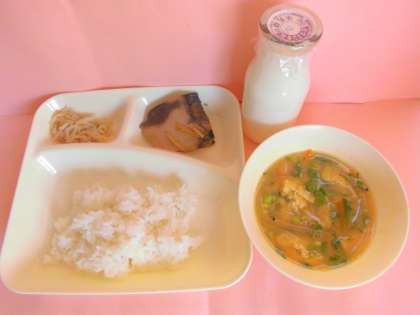 10/11(水)の献立は、なまりぶしのしょうが煮、みそ汁、もやしのごまあえ、ごはん、牛乳でした。