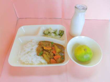 10/12(木)の献立は、ポークカレーライス〔米粉〕、グリーンサラダ、みかん、牛乳でした。