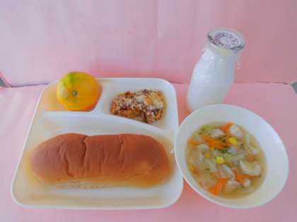 10/26(木)の献立は、なすのミートグラタン、鶏肉と野菜のスープ、みかん、黒糖パン、牛乳でした。
