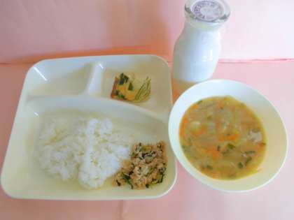 11/17(金)の献立は、千草焼き、みそ汁、ツナっ葉いため、ごはん、牛乳でした。