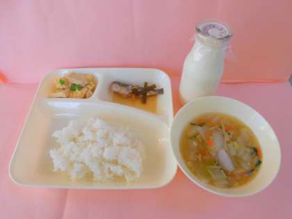 12/14(木)の献立は、いわしのしょうが煮、うすくず汁、高野どうふの卵とじ、ごはん、牛乳でした。