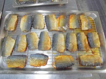 本日の給食にはさばのみぞれかけが登場しました。調理員さんは、魚同士がくっつくと見栄えが悪くなるからと一度に焼く量を標準より少なくして時間をかけて仕上げていました。1年生のクラスを回り、とてもおいしいと思う人とたずねたところ、89人中83名が挙手していました。