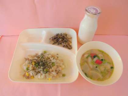1/11(木)の献立は、れんこんのちらしずし、牛乳、ぞう煮、ごまめ、牛乳でした。