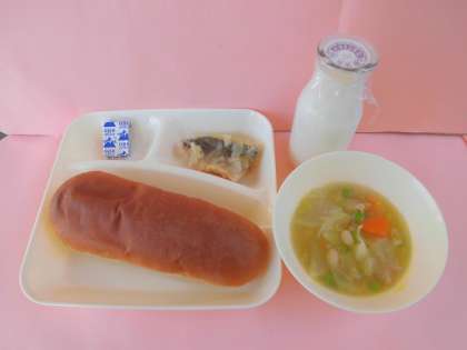 1/15(月)の献立は、あじのレモンマリネ、スープ煮、固形チーズ、黒糖パン、牛乳でした。