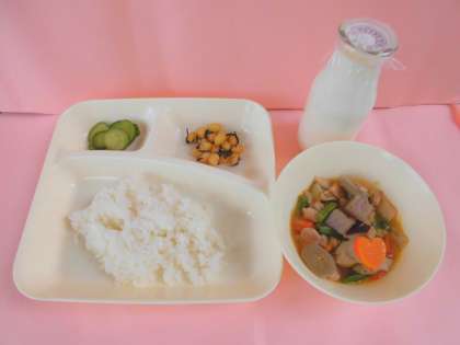 1/17(水)は、筑前煮、ひじき豆、きゅうりのかつお梅風味、ごはん、牛乳でした。