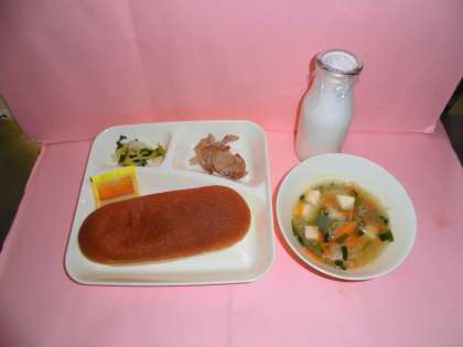 1/23(火)の献立は、豚肉のオイスターソース焼き、糸寒天のスープ、ピリ辛あえ、大型コッペパン、アプリコットジャム、牛乳でした。