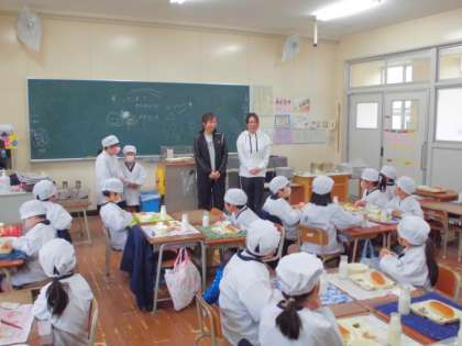 すみれ小学校では、22日〜26日より校内での給食週間としています。児童朝会での給食週間のお知らせ、一年生と調理員さんとの交流給食、ビデオ放送、児童集会での委員会児童による発表等を行う予定です。写真は、1年生と給食調理員さんとの交流給食の様子です。