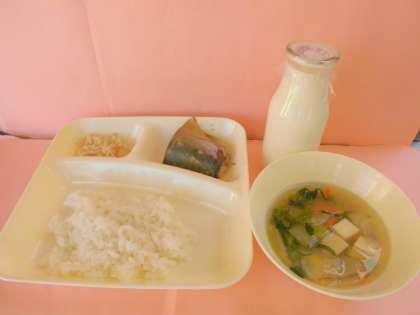 1/24(水)の献立は、さばのみそ煮、すまし汁、もやしのゆずの香あえ、ごはん、牛乳でした。