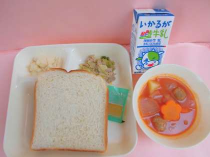 2/15(木)の献立は、ミートボールと野菜のケチャップ煮、ツナと野菜のソテー、カリフラワーのレモン風味サラダ、食パン、りんごジャム、牛乳でした。