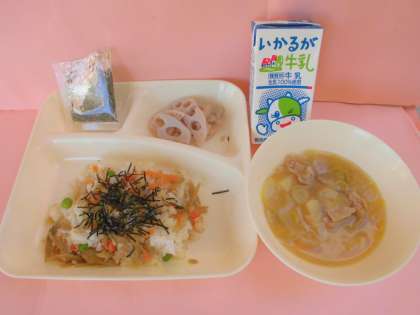 2/20(火)の献立は、鶏ごぼうご飯、みそ汁、焼きれんこん、牛乳でした。