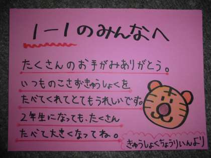 1月末の学校給食週間では、児童から調理員さんへたくさんのメッセージが届きました。今日は調理員さんから各クラスに手書きのメッセージカードが手渡されました。調理員さんには、調理業務だけでなく児童のことを大切に考えていただき、日々、温かい対応をしていただいています。
