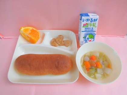 3/9(金)の献立は、鶏肉のみそマヨネーズ焼き、ウインナーのスープ煮、デコポン、ライ麦パン、牛乳でした。