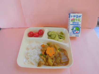 3/13(火)の献立は、チキンカレーライス、キャベツときゅうりのサラダ、プチトマト、牛乳でした。