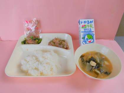 3/16(金)の献立は、豚肉の梅風味焼き、みそ汁、菜の花のおひたし、ごはん、牛乳でした。