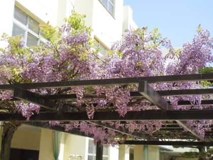 校庭の藤の花が満開に咲き、良い香りを放っています。