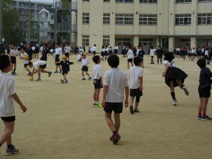 休み時間にはたくさんの子どもが運動場に出て、おにごっこやドッジボール、なわとびなどをして遊んでいます。