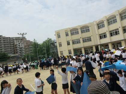 子どもたちが創立60周年を祝う取り組みとして作成したシンボルマークの人文字を作り飛行機から撮影してもらいました。子どもたちは上空の飛行機を見つけると思わず歓声を上げていました。写真の出来上がりが楽しみです。