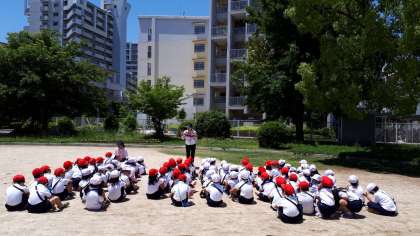 1年生が学校のすぐ隣にある古市中央公園に遊びに行きました。生活科の学習で、遊ぶ前には「遊具で遊ぶだけでなく、公園にはほかに何があるか見つけましょう」と先生からお話がありました。
