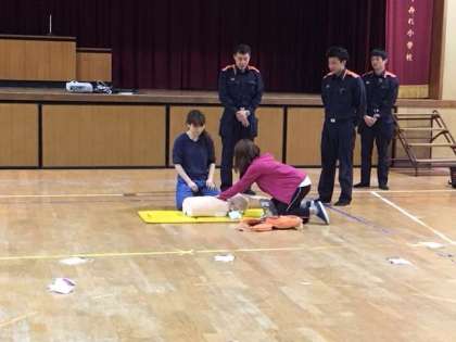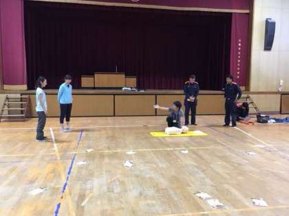 城東消防署の消防士に来ていただきAEDを用いた救命方法を教えていただきました。
