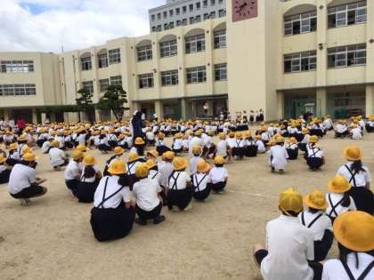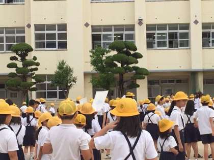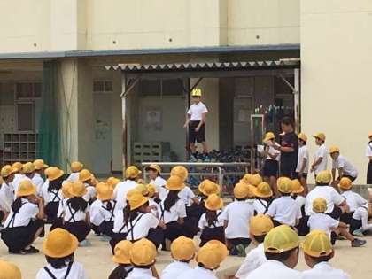 まず、先日編成したたてわり班で並びました。初めてということもあり自分の班がわからない低学年の児童もいましたが、6年生の班長を中心に協力して並ぶことができました。