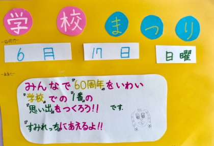 学校の階段の踊り場に掲示委員会が作成した創立60周年記念日と学校まつりのポスターが掲示されていました。どのポスターからも子どもたちが楽しみにしている様子が伝わってきました。