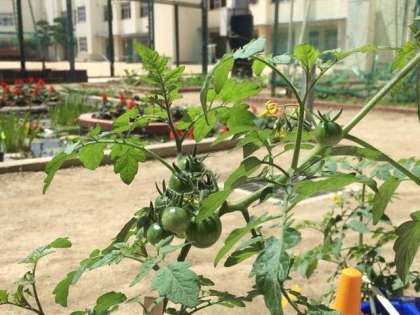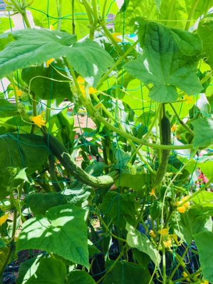 学習園にトマトやキュウリが実をつけていました。先日1年生は教室の裏に置いている朝顔に支柱を立てていました。