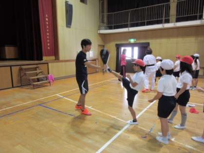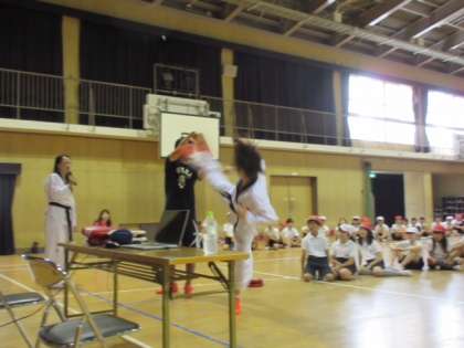 お話の後にテコンドーの実演と体験をしました。岡本さんの板割りなどの実演に子どもたちの目は釘づけでした。そのあと子どもたちは大きな声を出し、ミット蹴りや板割りを楽しく体験することができました。