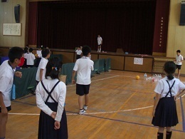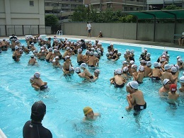 1年生は、6年生と一緒に小学校の大きなプールに入りました。