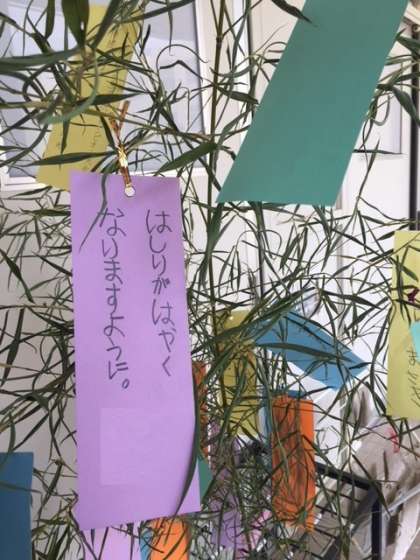 1年生の教室の前に地域の方が届けてくださった七夕の笹が飾ってありました。笹にはかわいい願い事がたくさん書いてありました。願い事が叶うといいですね。