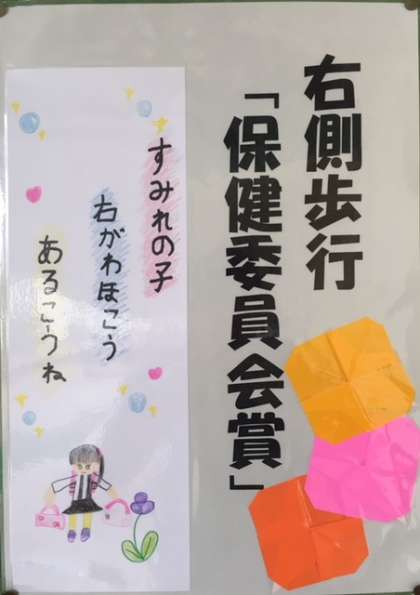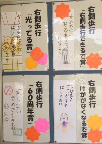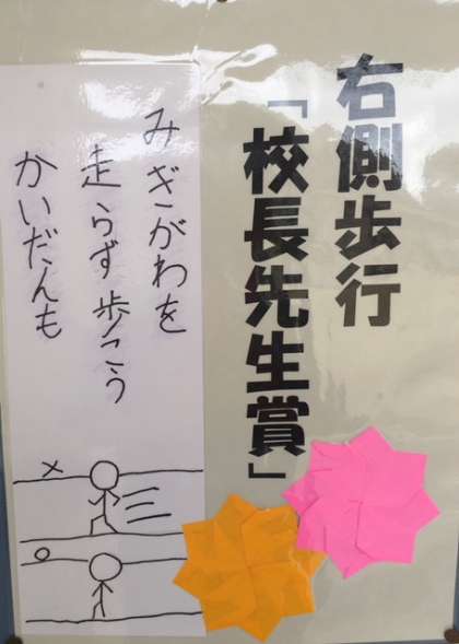 右側歩行を呼びかける川柳のコンテストが行われ受賞作品が校長室前と保健室前に掲示されました。