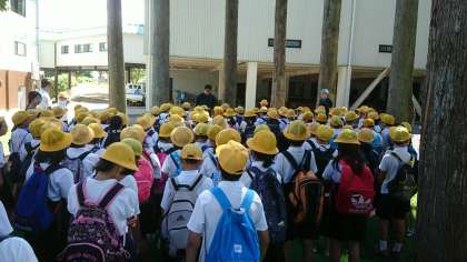 開舎式で宿舎の方に「よろしくお願いします」と挨拶をしました。宿泊する部屋に入り、荷物を整理したころ、避難訓練が始まります。