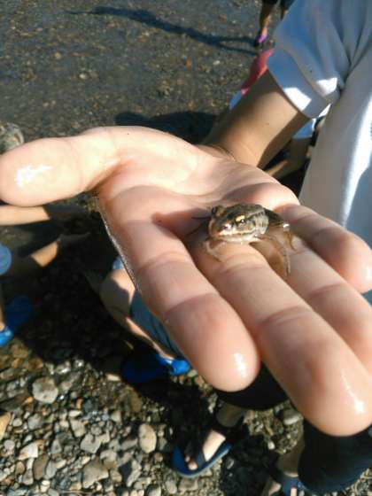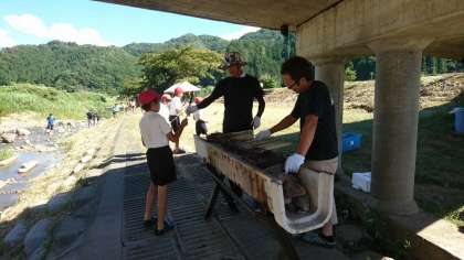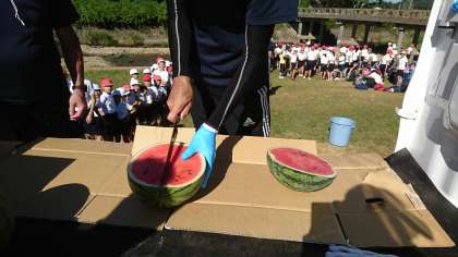 つかまえた魚を焼いて食べ、その後スイカを食べました。川原で長い時間を過ごし、川遊びも満喫しました。
