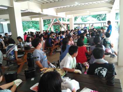 飯ごう炊さんが始まりました。食材を切って煙に涙しながらカレーを作っています。おいしくできるかな?