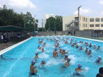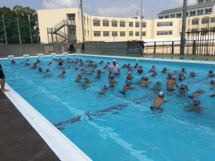 猛暑日が続いているのでプールサイドに水筒を持っていきこまめに給水しながら学習しています。