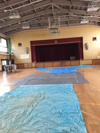 講堂内には雨漏りの対策としてビニールシートを敷いております。